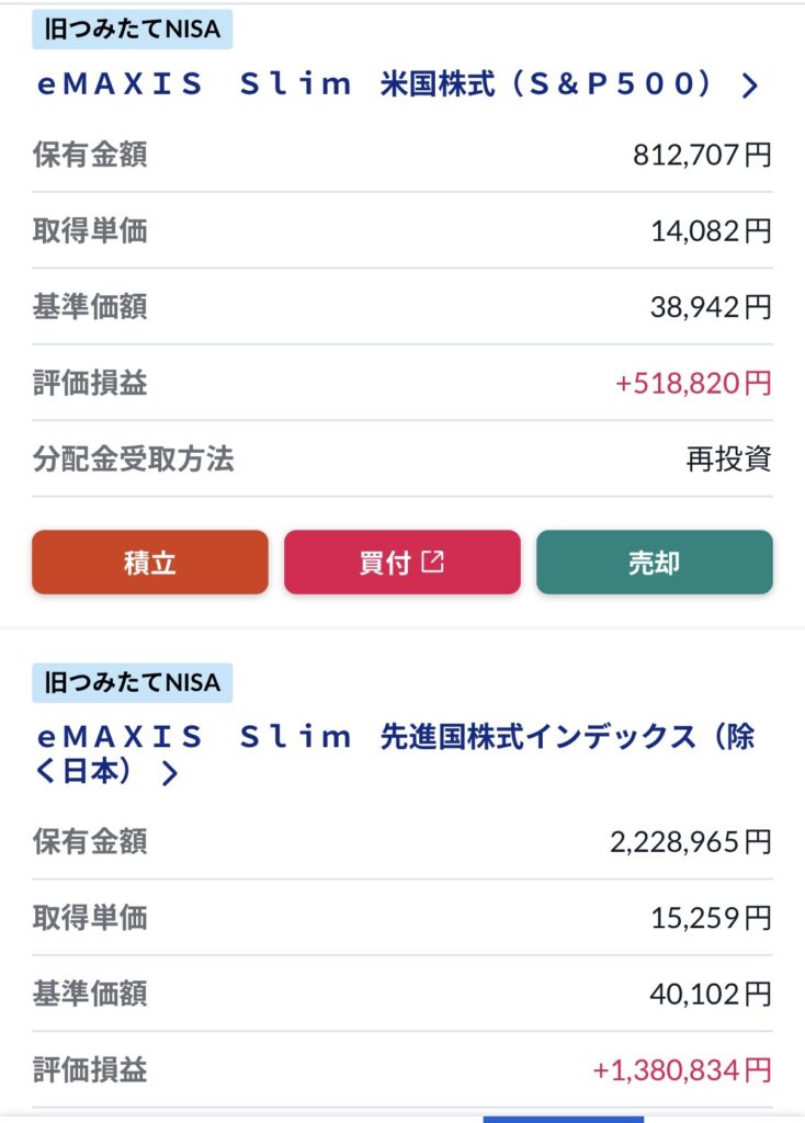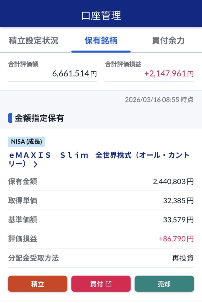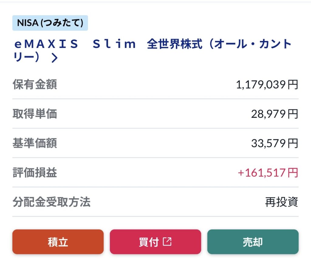 旧NISAの銘柄も残っていますが、現在の積立は「全世界株式(オルカン)」のみです。